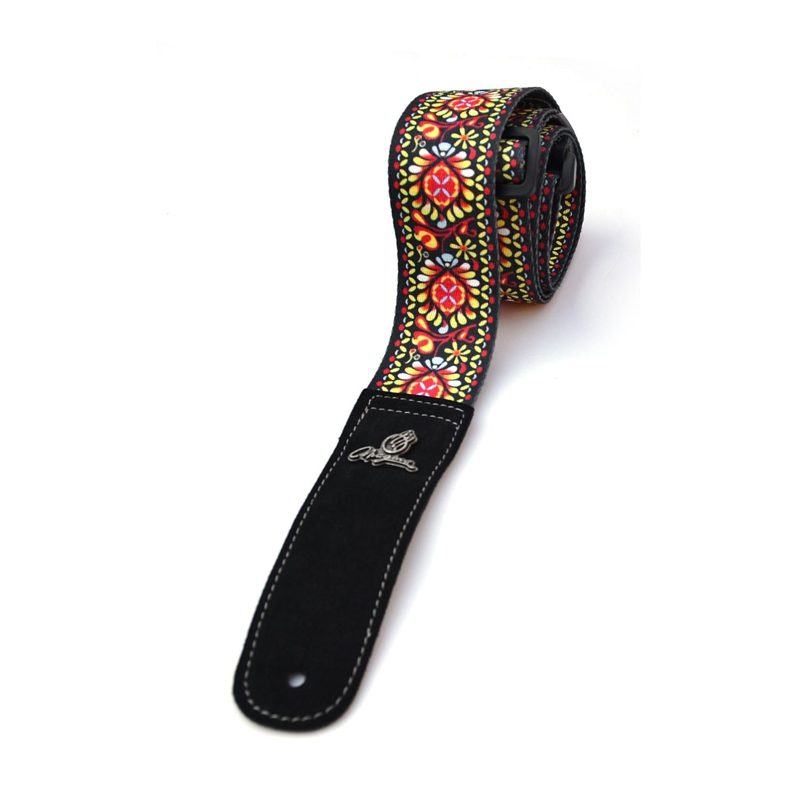 Tracolla per chitarra in poliestere morbido da 2" di Magma Leathers, stampata a sublimazione con motivo Woodstock rosso, estremità in vera pelle (07MS01RW.)